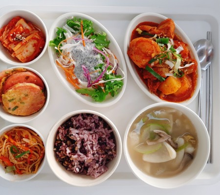 닭개장 동그랑땡전 흑임자두부샐러드 오이무침 김치