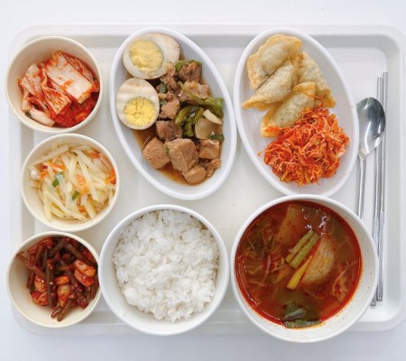 육개장 돈육계란조림 비빔만두 감자채볶음 마늘쫑락교무침 포기김치