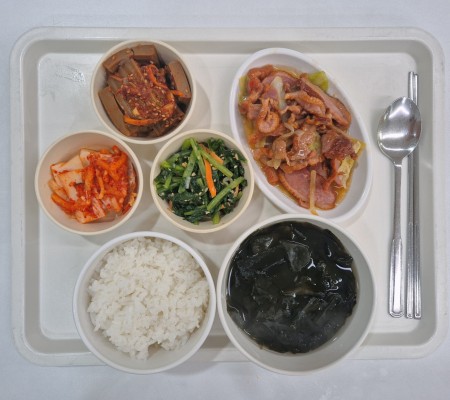 바지락살미역국 훈제오리볶음 도토리묵*양념장 열무무침 포기김치
