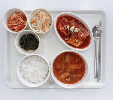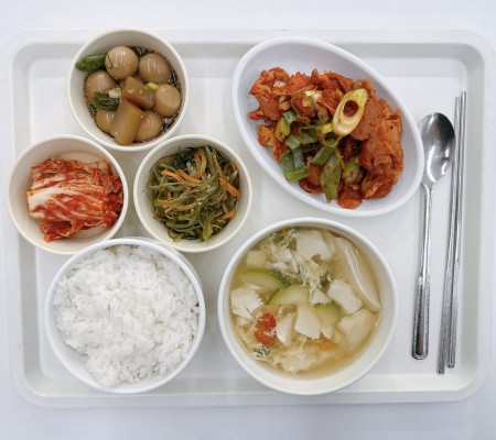 맑은순두부탕 매운훈제오리볶음 메알곤약조림 미역줄기볶음 포기김치