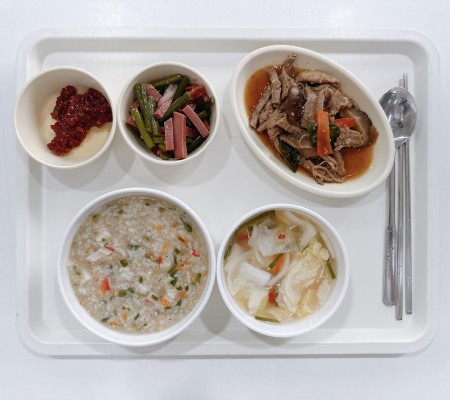 게살죽 돈안심장조림 햄마늘쫑볶음 씨앗젓갈 나박물김치