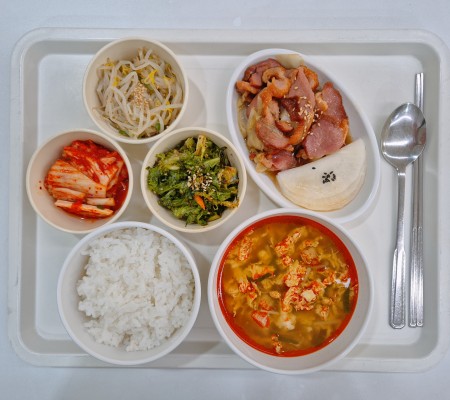 순두부찌개 함박스테이크 샐러드파스타 연근조림 마늘쫑무침 포기김치
