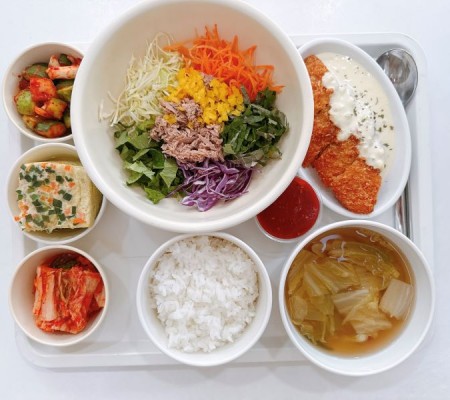 참치생야채비빔밥 배춧국 생선까스 계란찜 오이무침 포기김치