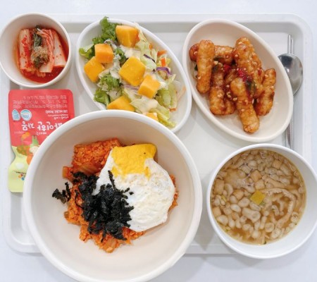 김치볶음밥 유부우동국 계란후라이 간장돈육강정 양상추샐러드 포기김치