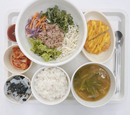 참치생야채비빔밥 배춧국 치킨까스 청포묵무침 포기김치