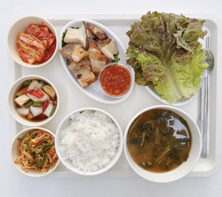 시래기된장국 삼겹살 상추/쌈장 수제양파장아찌 콩나물무침 포기김치