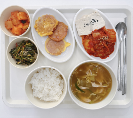 떡국 동태조림 애호박볶음 올방개묵무침 포기김치