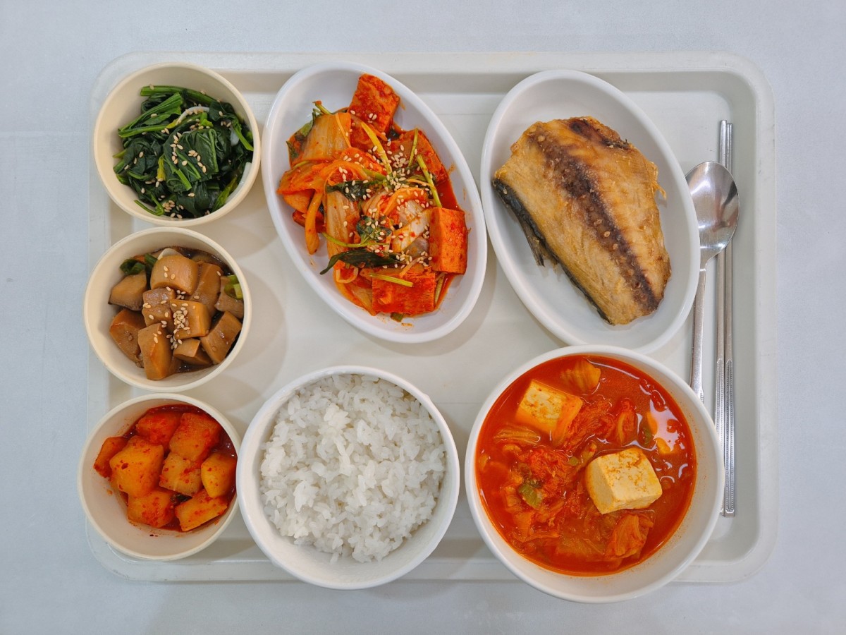돈육김치찌개 삼치구이 부대볶음 새송이볶음 시금치무침 깍두기