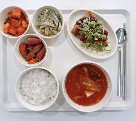 김칫국 방어데리구이 소세지볶음 궁채볶음 깍두기