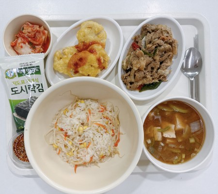미소장국 돈까스 쫄면무침 느타리애호박볶음 오이맛살무침 깍두기