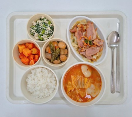 김치수제비 훈제오리볶음 메알곤약조림 쑥갓두부무침 깍두기