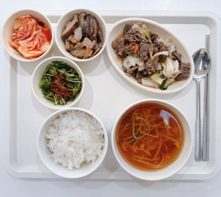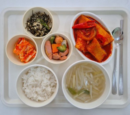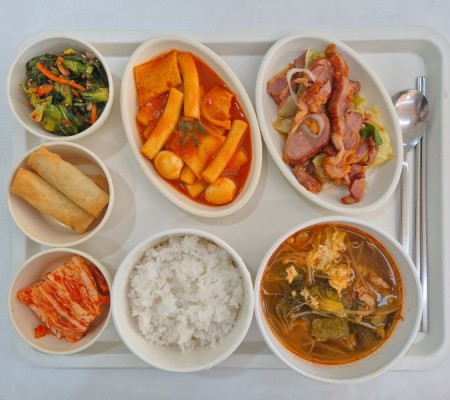 버섯육개장 훈제오리볶음 떡볶이 춘권튀김 청경채겉절이 포기김치