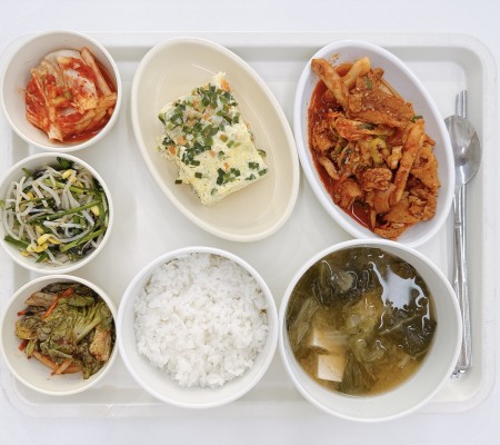 얼갈이된장국 오징어제육볶음 계란찜 콩나물김무침 상추겉절이 포기김치