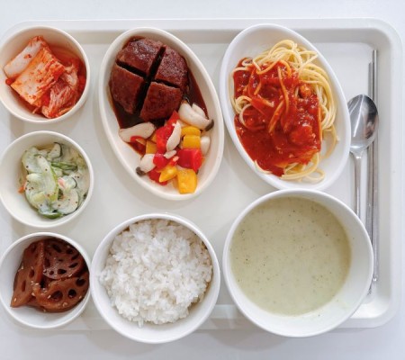 브로콜리스프 떡갈비조림 토마토스파게티 연근조림 오이샐러드 포기김치