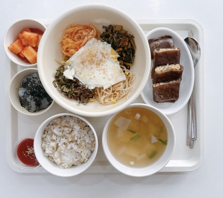 열무비빔밥 감자양파국 계란후라이*고추장 메밀전병 올방개묵무침 깍두..
