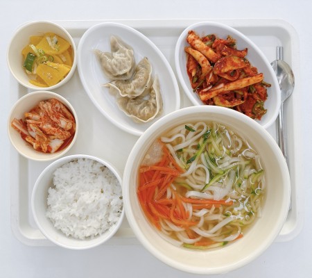칼국수 미니밥 오징어초무침 만두찜 단무지/주스 포기김치