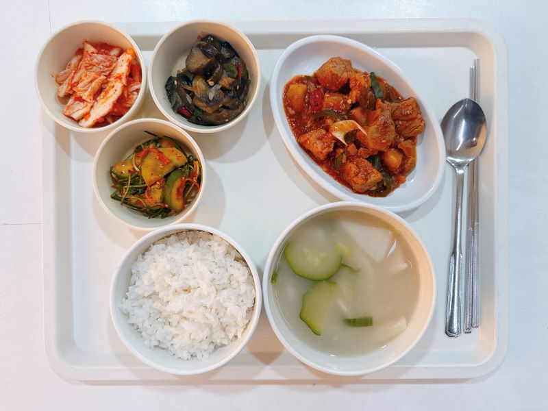 수제비국 매운돈사태찜 가지볶음 세발오이무침 포기김치