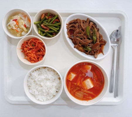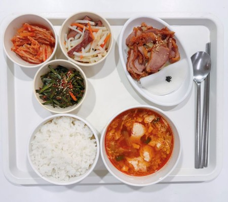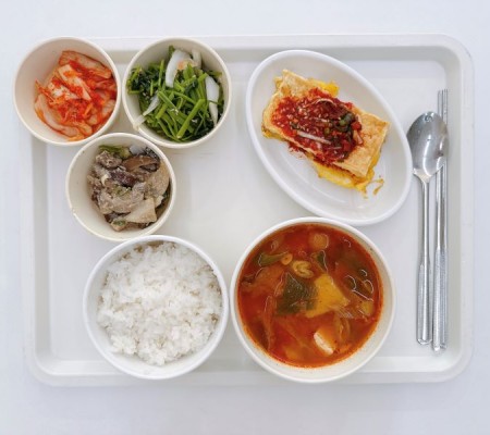돈육고추장찌개 두부계란부침 표고버섯볶음 참나물무침 포기김치