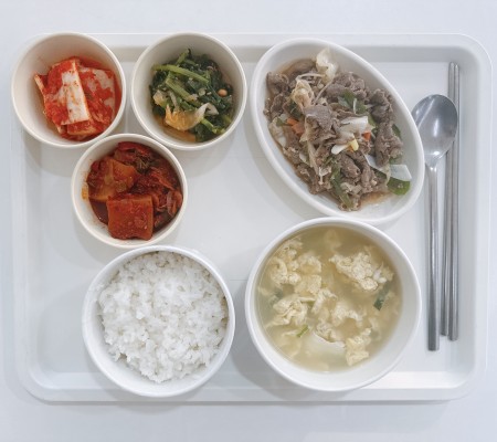 계란국 소불고기 건새우무조림 열무무침 포기김치