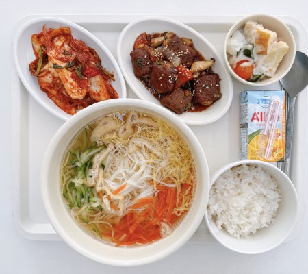 잔치국수 미니밥 떡갈비조림 생과일샐러드 배추겉절이 주스