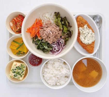 참치생야채비빔밥 미소장국 생선까스 계란찜 단무지무침 포기김치