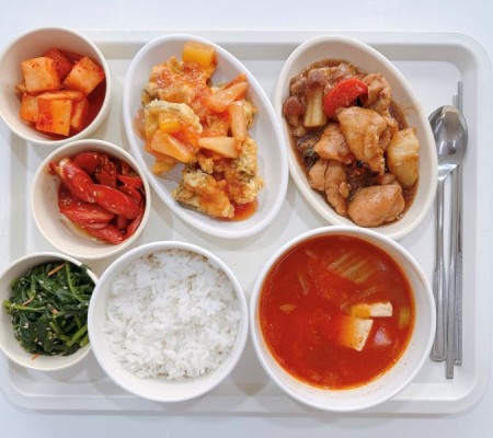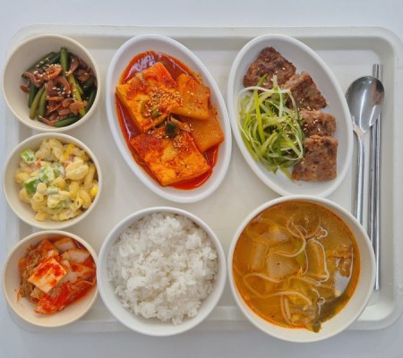 참치김치찌개 순살찜닭 가지탕수 후랑크야채볶음 열무무침 깍두기
