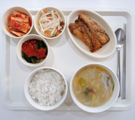 콩가루배춧국 삼치구이 감자채볶음 물미역/초장 포기김치