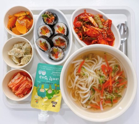 칼국수 김밥 오징어초무침 물만두 단무지/주스 포기김치