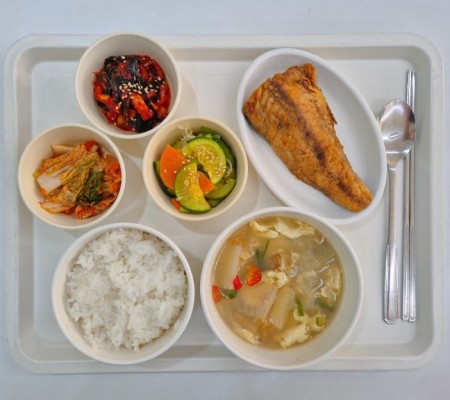 배추된장국 오징어불고기 계란찜 볼어묵조림 마늘쫑무침 포기김치