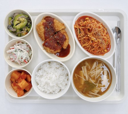 미소장국 돈까스 쫄면무침 느타리애호박볶음 오이맛살무침 깍두기