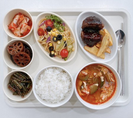 순두부찌개 함박스테이크 샐러드파스타 연근조림 마늘쫑무침 포기김치
