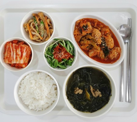 소고기미역국, 닭살야채조림, 어묵볶음, 돌나물*초장, 김치