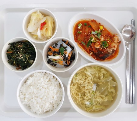 계란국, 삼치김치조림, 깻순나물, 청포묵김무침, 백김치