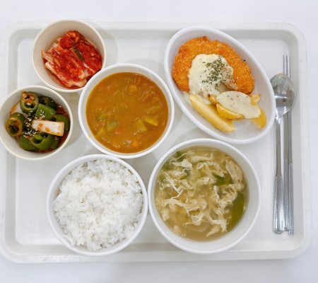계란국 카레 새우까스 고추양파무침 포기김치