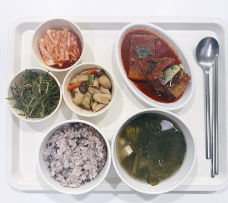 미역국 민찌두부조림 우엉채조림 시금치나물 포기김치