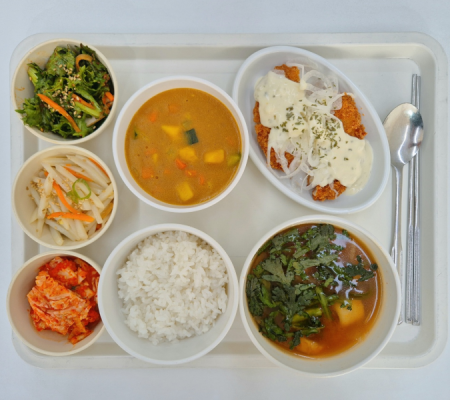 매운어묵국 카레 어니언치킨까스 감자채볶음 치커리겉절이 포기김치