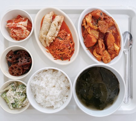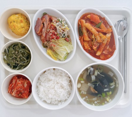 홍합탕 훈제오리야채찜 떡볶이 미역줄기볶음 단호박샐러드 포기김치