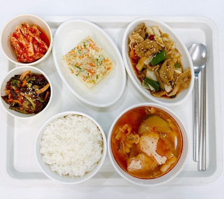 참치김치찌개 버섯돈육불고기 계란고추장조림 도라지나물 깍두기