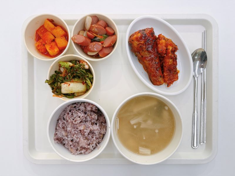 버섯들깨탕 동태강정 후랑크볶음 봄동겉절이 깍두기