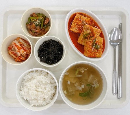 오징어찌개 날치알계란찜 우엉채조림 쑥갓두부무침 포기김치