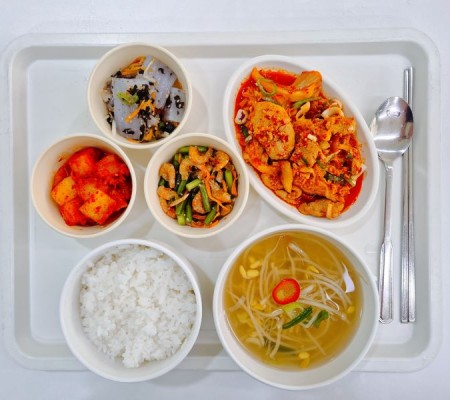 콩나물국 제육김치지짐 건새우마늘쫑볶음 올방개묵무침 깍두기