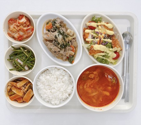순두부찌개 들깨백불고기 치킨텐더샐러드 새송이짬뽕볶음 부추무침 포기..