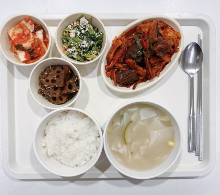 수제비 오징어순대볶음 연근조림 쑥갓두부무침 포기김치