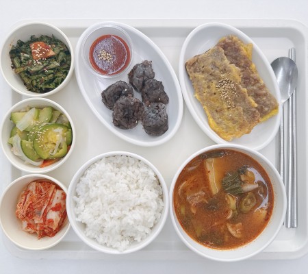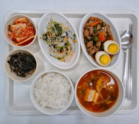 부대찌개 두부조림 궁중떡볶이 감자채볶음 얼갈이나물 포기김치