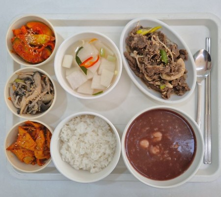 동지팥죽 소불고기 어묵볶음 느타리야채볶음 오이도라지무침 동치미