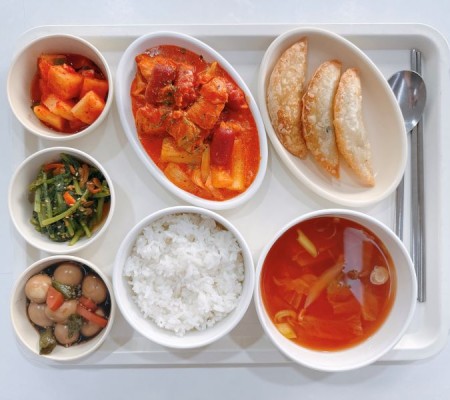 김칫국 훈제오리통마늘볶음 크림떡볶이 무생채 부추무침 백김치